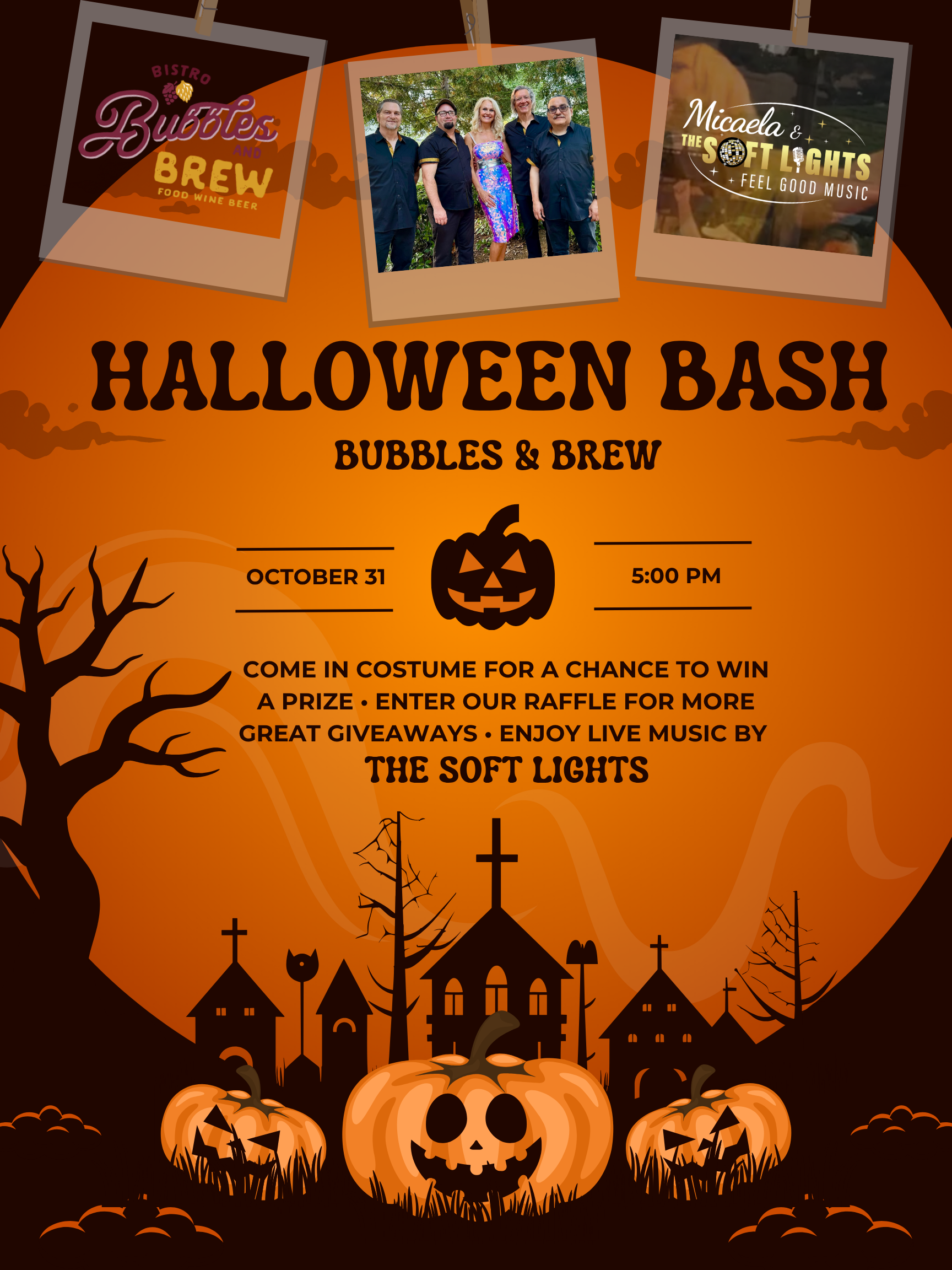 Come in your costume and enjoy live music by the Soft Lights at Bubbles & Brew on Halloween night!