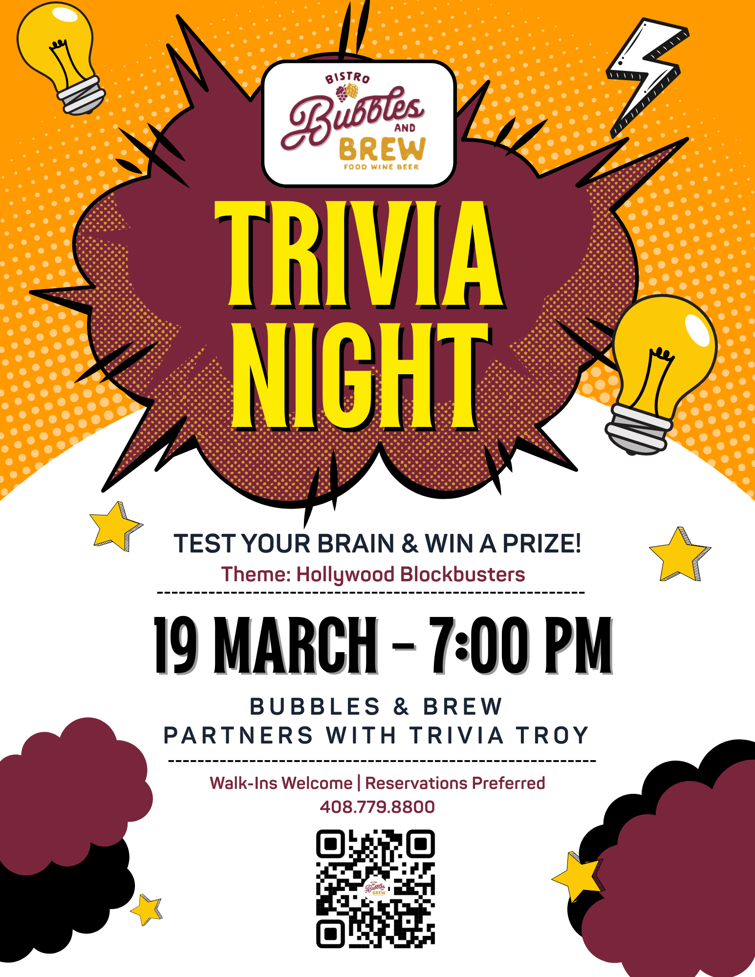 Trivia Night is happening every third Thursday at Bubbles & Brew! We’ve teamed up with Trivia Troy to bring you a night of questions, competition, and a great atmosphere. Plus, each month features a special theme to keep things interesting. Gather your team and join fun!