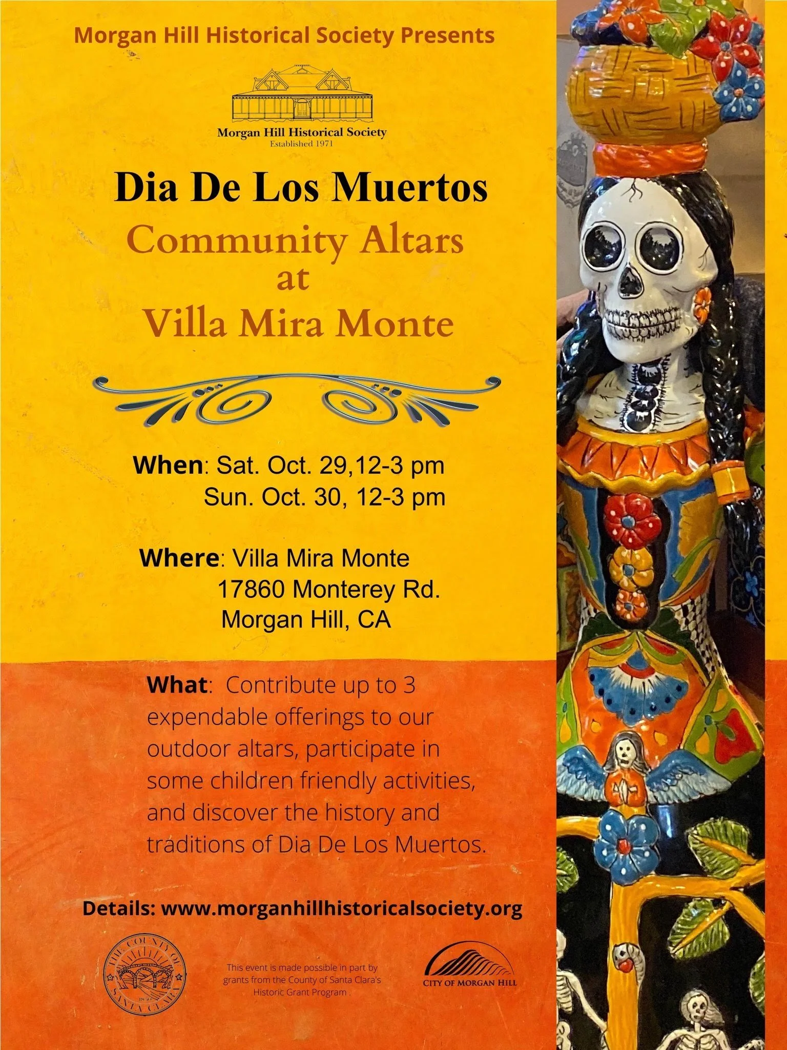 Morgan Hill Historical Society invites you to celebrate in honor and rememberance of departed loved ones and ancestors at their Día De Los Muertos Community Altars at Villa Mira Monte