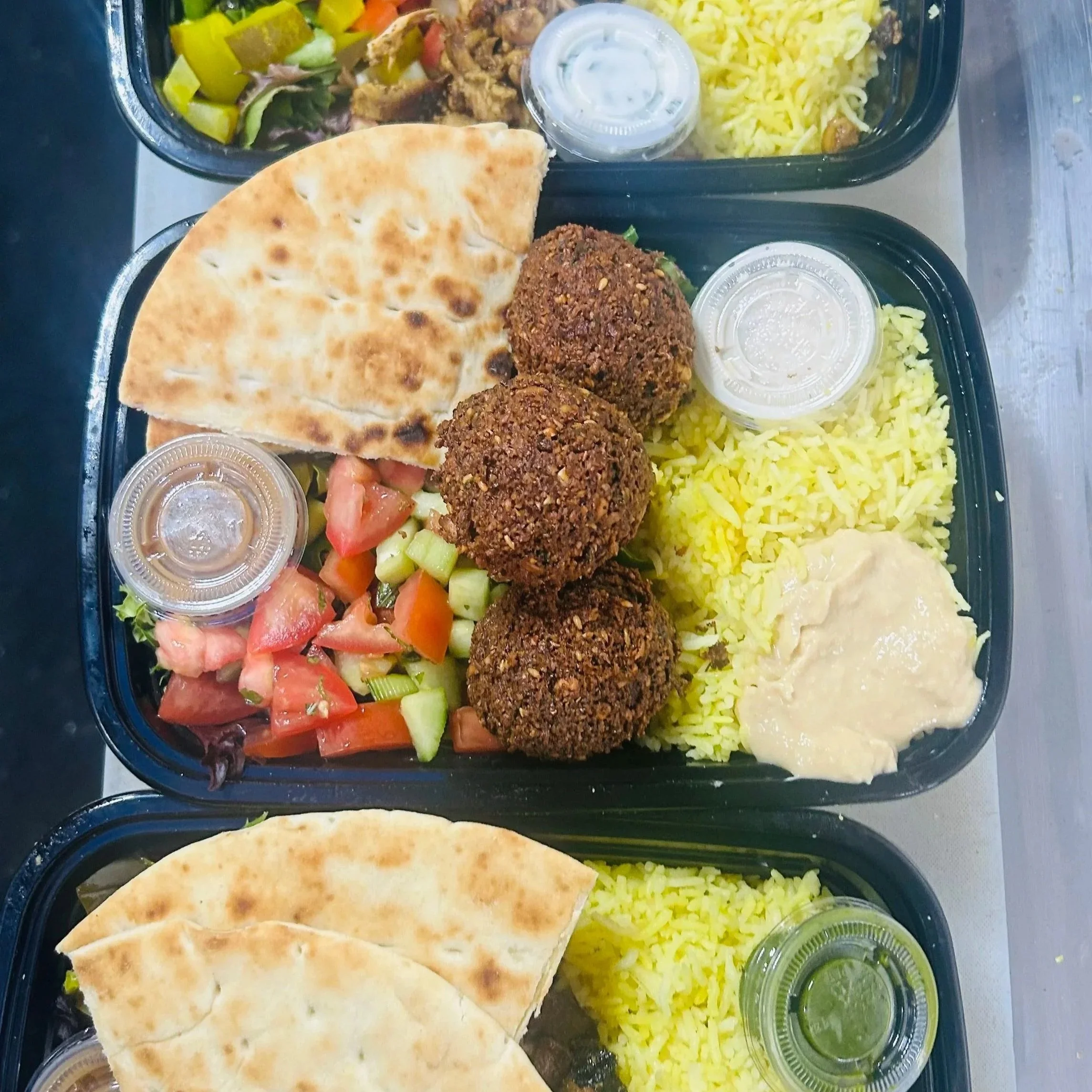 Our Mediterranean Bowls are Hearty & Healthy bursting with so many flavors. Begin with a base of Tumeric rice & crispy greens, tomato cucumber mint salad, warm pita wedge, hummus or garlic dip & finished with one of our signature sauces; Cilantro Mint Chutney, Yogurt Mint Sauce or Traditional Tahini Sauce. Choice of proteins include; Steak Shawarma, Chicken Shawarma or Falafel (V) all for $14