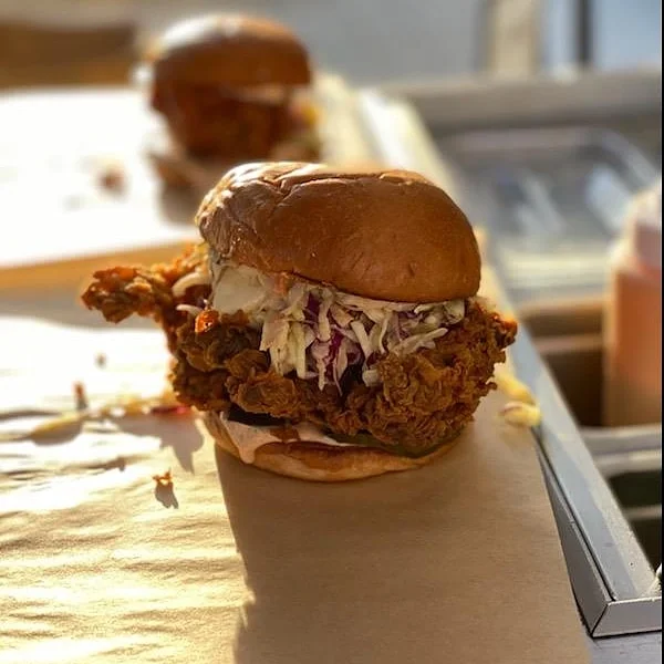 Buttermilk Brined Fried Chicken on a Freshly Baked Brioche Bun: 4 versions — The Original "Trendy" (Slaw and Pickles), The Fast Franks (Bufflao and Blue Cheese), The CALI (Avocado, Swiss Cheese, Lettuce and Tomato) and The COCHI LOCO (HOT, HOT, HOT-- with our Housemade Chili Oil)