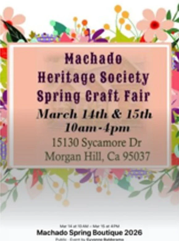 Machado Heritage Society Spring Craft Fair Saturday, March 14, 2026 10:00 AM 10:00 Sunday, March 15, 2026 4:00 PM 16:00 15130 Sycamore Drive Morgan Hill, CA, 95037 United States (map) Google Calendar ICS Machado Heritage Society Spring Craft FairThe event features handmade items for Easter, Mother's Day, Father's Day, and graduation, alongside food and treats.